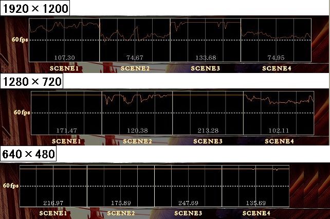さほど差は出ていませんが、解像度が高いほど平均フレームレートは低くなっていることがわかります。 またベンチマークで最も重い場面をそれぞれの解像度で比べた場合、解像度1920×1080ではfpsが30近くまで低下したのに対し、解像度640×480ではfpsは80以上出ていました。 次はデビルメイクライ4のベンチマークです。