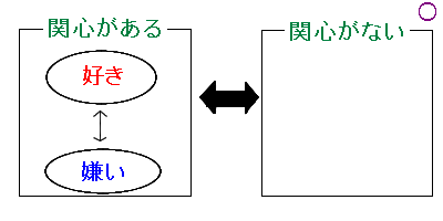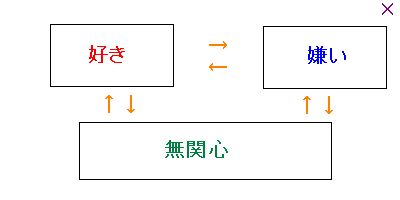 インターネット上でよく見かけるこの言葉はご存じでしょうか。 「好きの反対は無関心である」 「愛情の反対は無関心である」 原文はマザーテレサが言ったものとされています。 "The opposite of love is not hate but indifference." よーく調べてみると、仮にマザーテレサが言ったとすれば後者の「愛情の反対は無関心である」が本意のようです。 "Love"を翻訳する際に解釈が間違っていったのかもしれないですね。 この言葉について考えてみましょう。 まず「愛情」はマザーテレサが使ったキーワードの一つです。 私は特別に調べたことはないのですが、彼女の言葉の節々からは「人は食料やお金といったものよりも愛情を欲している」ことが読み取れます。 この愛情という感情は好きとか嫌いの問題ではなく、神から与えられるものとしています。 つまり何かしらの感情をかけてあげている状態が、マザーテレサにとっては愛情と表現されています。 例えばこんなことを言っています。 "Being unwanted, unloved, uncared for, forgotten by everybody, I think that is a much greater hunger, a much greater poverty than the person who has nothing to eat. " 食べる物が何もない人のひもじさや餓えをしのごうと食べ物を望む気持ちよりも、誰からも必要とされず愛されず気にされず忘れ去られた人にとっての愛情の少なさや愛情を欲している気持ちの方が強いと私は思うのです。 これでマザーテレサの考えがわかったと思います。 病気になった人が病室のベッドで寂しく闘病するとき最もうれしいのはなんだと思いますか? マザーテレサ流に言えば、愛する人、心を許せる友人、看護師、そしてだれでも良いから愛情をかけてくれることなのです。 これでマザーテレサの話題は終わり。 「好きの反対は無関心である」という言葉について考えてみましょう。 ある意味拡大解釈された言葉でもありますが、何人かの思想家や作家はこの言葉を使っています。 ●ロロ・メイ(心理学者) "Hate is not the opposite of love; apathy is." 憎しみは愛することの反対ではない。憎しみの反対は無感情なのだ。 ●エリ・ヴィーゼル(作家) "The opposite of love is not hate, it's indifference. The opposite of art is not ugliness, it's indifference. The opposite of faith is not heresy, it's indifference. And the opposite of life is not death, it's indifference." 好きであることの反対は嫌いなことではなく、無関心だ。 芸術的なものの反対は醜いものではなく、重要でないことだ。 正統な信仰の反対は異端な信仰ではなく、どっちつかずの中立状態か無宗教状態だ。 そして生きることと背中合わせなのは死ではなく、何も考えずににダラダラ過ごしていることだ。 (かなり怪しい訳が含まれているので話半分に) 以上二人の言葉を拝借してきましたが、二つともに共通する事柄があります。 それは、一般的に反対とされている言葉同士は根底に同じルーツが芽生えていることです。 憎しみも愛、好き嫌いも、関心があるからそんなな感情を抱きます。 関心がなければ感情すら抱きません。 芸術的であるかそうでないかは作品として認知されている時点で同じ土俵に立っています。 いくら美しくてもそれが価値を持たない限り、どうでもいいことです。 正統な信仰も異端派も、元をたどればおなじ宗教。 考えの違いによって分かれていますが、そもそも宗教について無関心ならば関係はない。 どっちにもつかず考えをハッキリさせない宗教家は同じ土俵に立っていない。 生きるの死ぬも、重大に苦しみを伴います。 しかし生産的な活動もせず何も考えずに、ブラブラするのは生きているのか死んでいるのか分かりません。 --------------------------------------------------------------------------------------- これを、表題の「好きの反対は無関心である」に当てはめてみます。 反対という言葉は、本来ならば対(つい)になるはずです。 したがって、この考えだと「好きの反対が無関心ならば、無関心の反対は好き」になってしまいます。 どうかんがえたっておかしいですよね。 これを推し進めると嫌いの反対も無関心となり、さらに好きと嫌いが反対になってしまいませんか? ![]() 好きの反対である無関心の反対は、嫌いとなり、嫌いの反対は好きという堂々巡りになってしまいます。 この問題は、好きと嫌いの後ろに隠れている「関心がある」という感情を考えてないことから生まれてきます。 言葉をはっきりと定義せずに曖昧にして、そしてきちんと説明せずに省略して使うから間違いが起こります。 好きも嫌いも気になる子、何も思わないのはどうでもいい子なのです。 ![]() 子供の頃、好きな子をいじめたくなるってことありませんでしたか。 それは好きと嫌いという感情がかなり近い位置にあるからなんだと思います。 他にも、野球でいうと熱烈なアンチ巨人の阪神ファンが居るとしましょうか。 この手のアンチは何も考えずに攻撃的に振る舞いをしている人も多いのですが、実のところ巨人についてよく知っている人が多いのです。 内情をよく知らなければアンチ活動も良